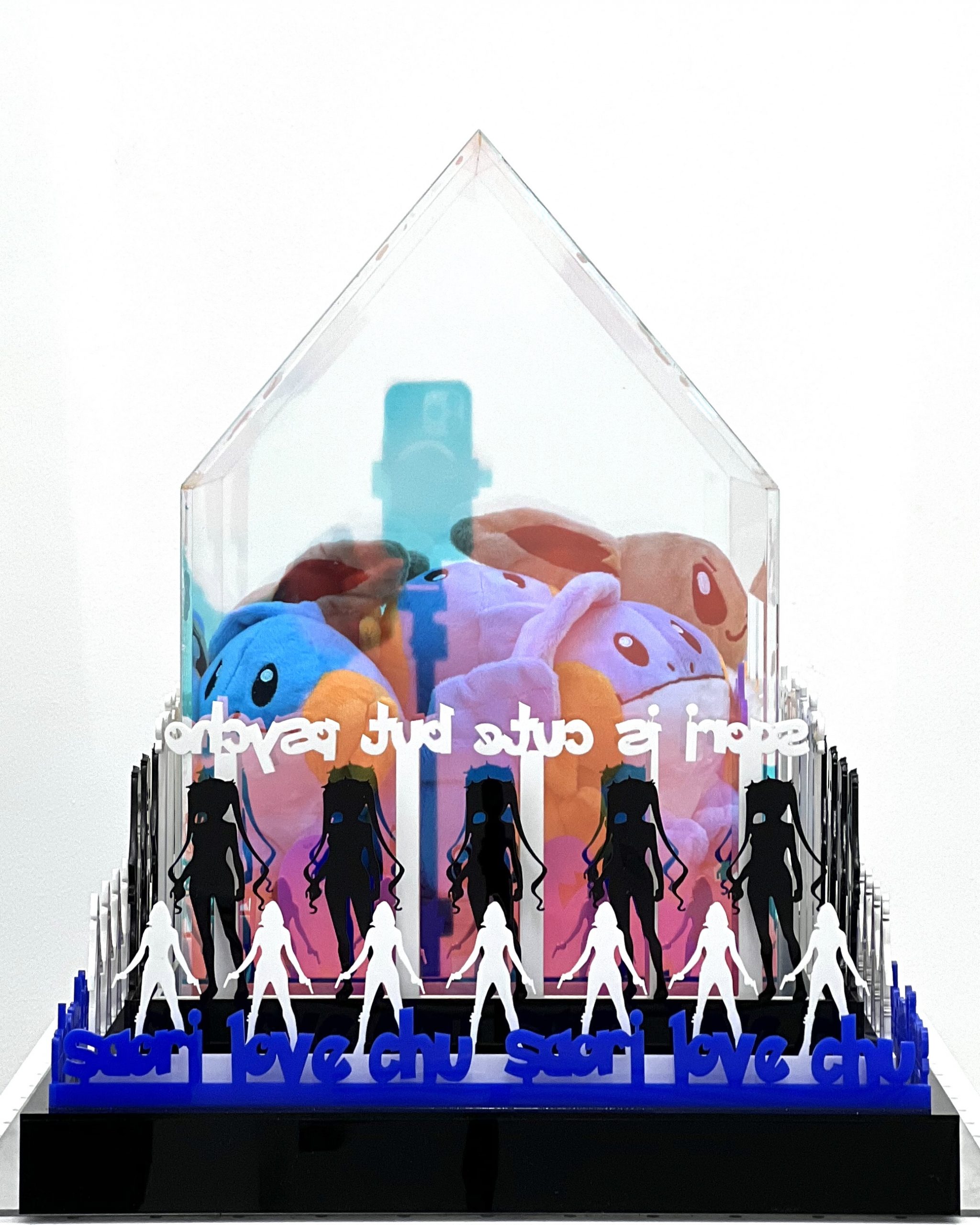 Adding to the whimsy are the kawaii sentences artistically integrated into the design – “Saori is a cute psycho” and “Saori love chu.” These phrases, playful and endearing, offer a glimpse into Nakamishi’s self-perception and her lighthearted approach to art. “Saori is a cute psycho” humorously acknowledges the creative madness that fuels her art, while “Saori love chu” (with ‘chu’ being an onomatopoeic representation of a kiss sound in Japanese) is a tender expression of love and affection, perhaps towards her art, her audience, or herself.